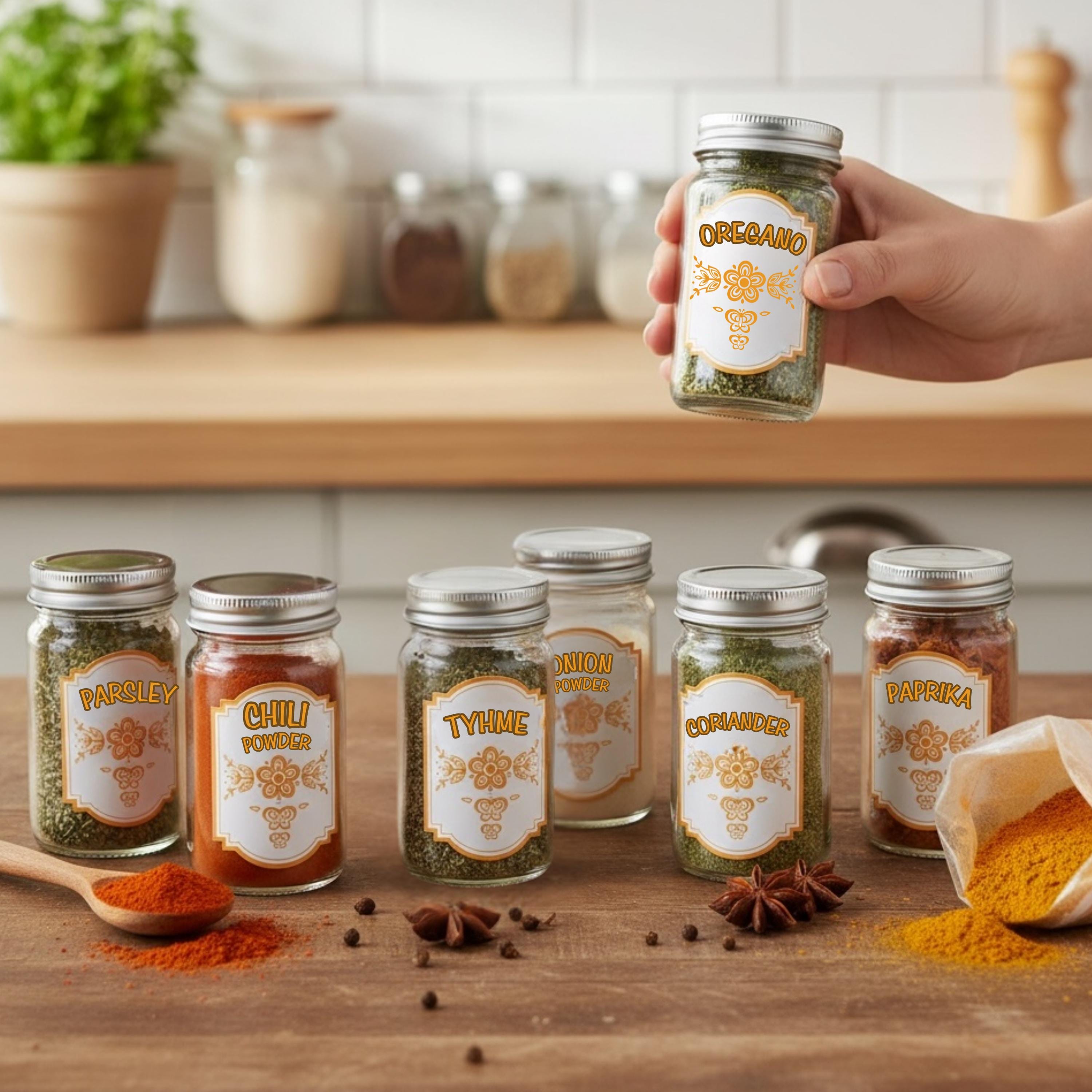 35 Labels: Includes essentials like Garlic Powder, Paprika, Thyme, and more.