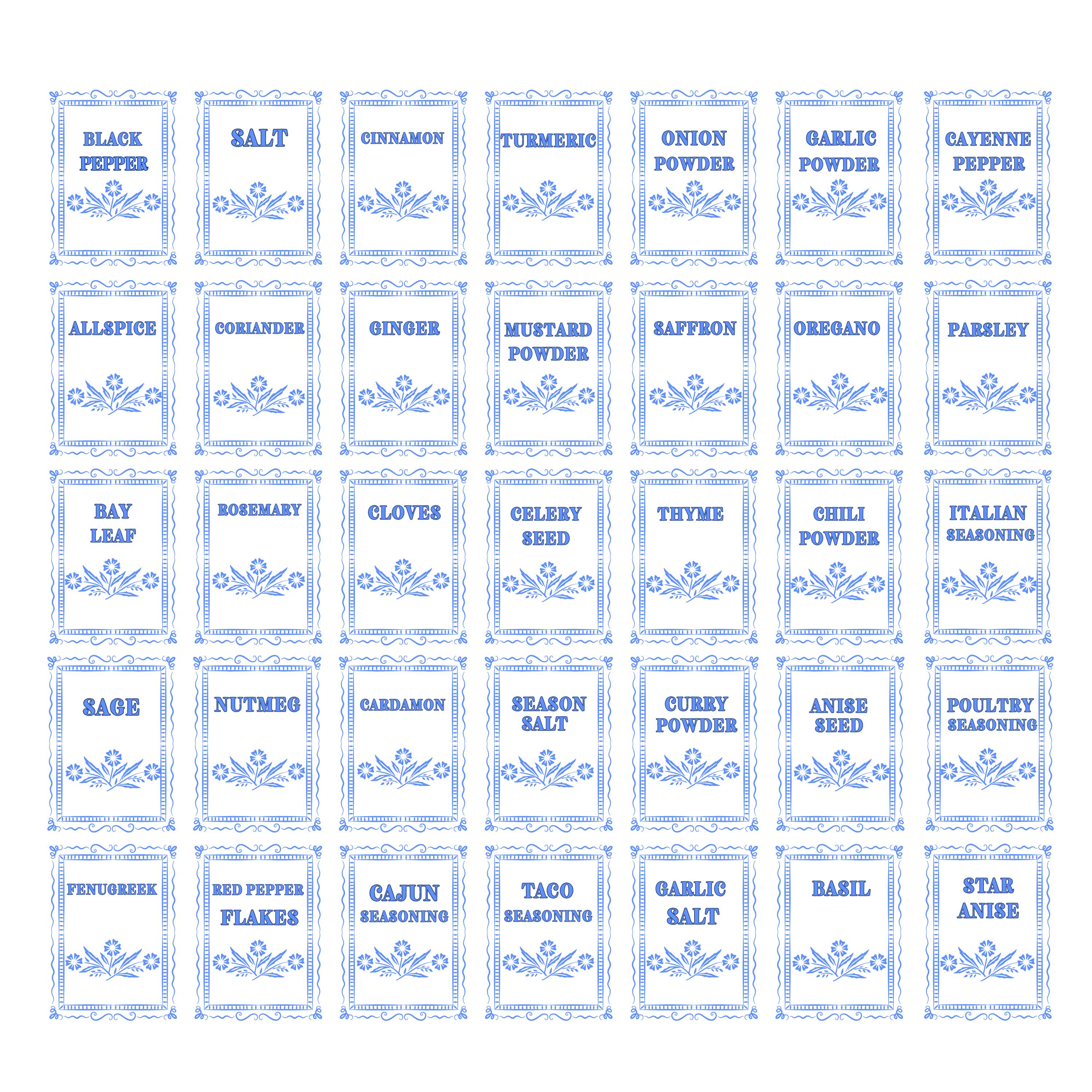 35 Labels: Includes essentials like Garlic Powder, Paprika, Thyme, and more.