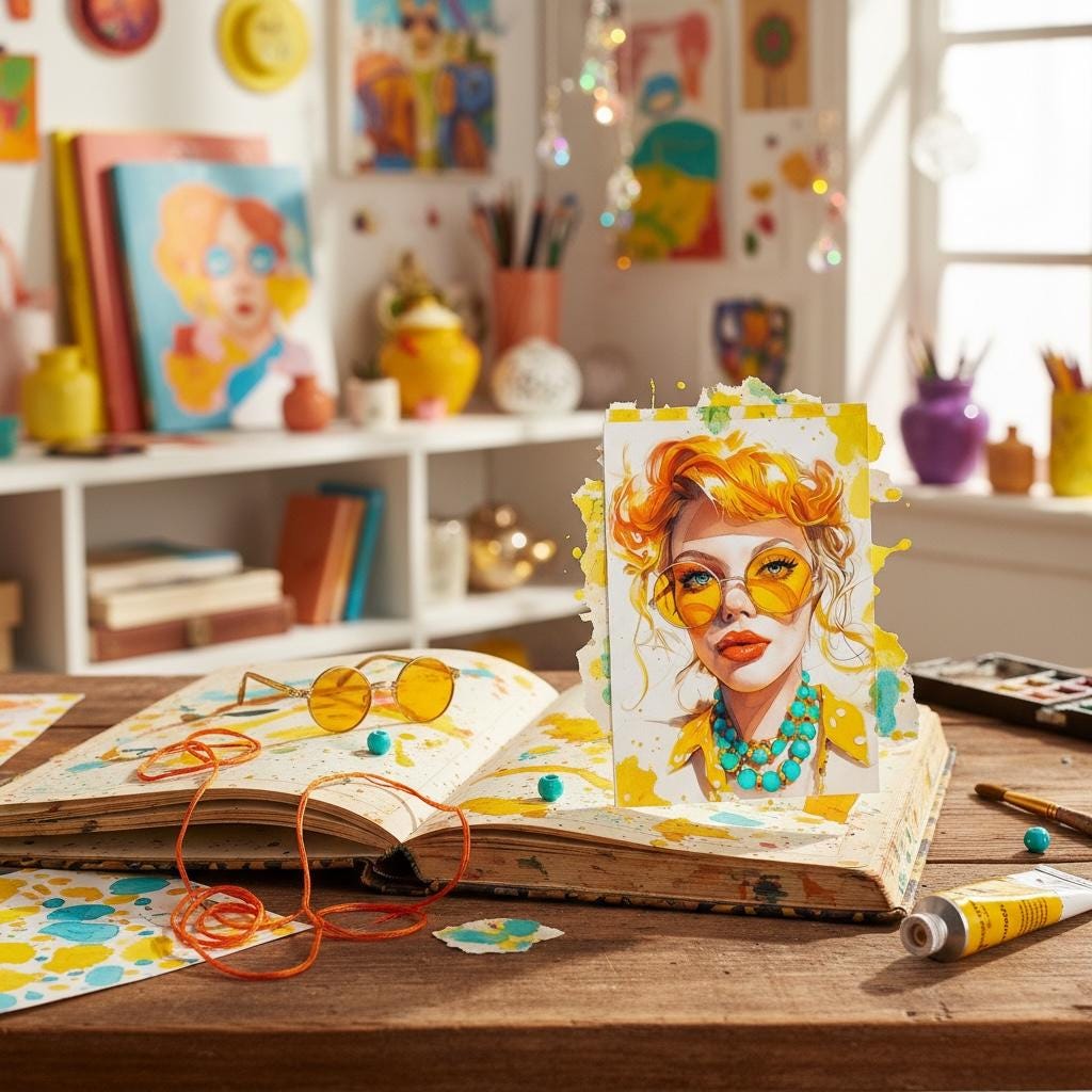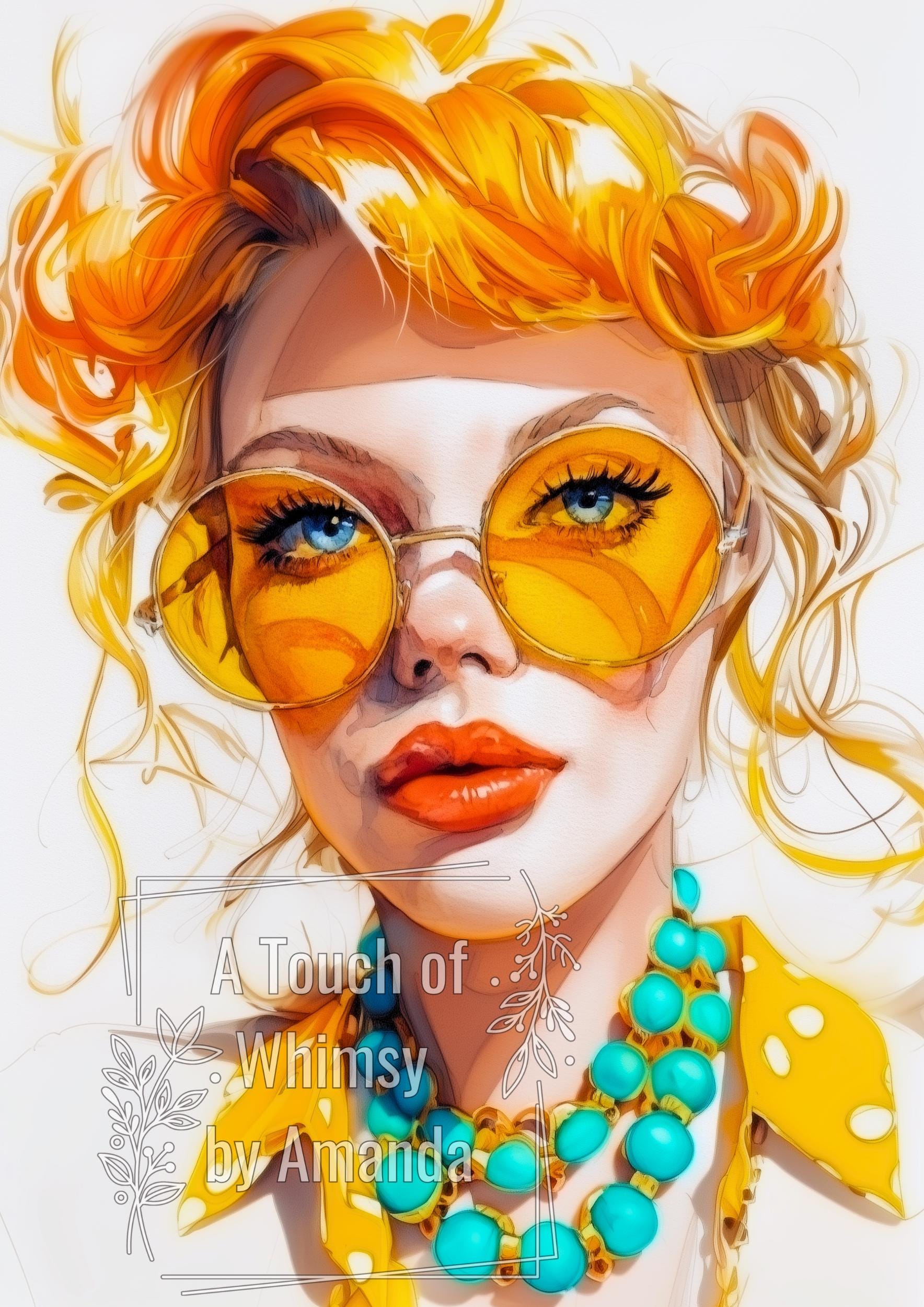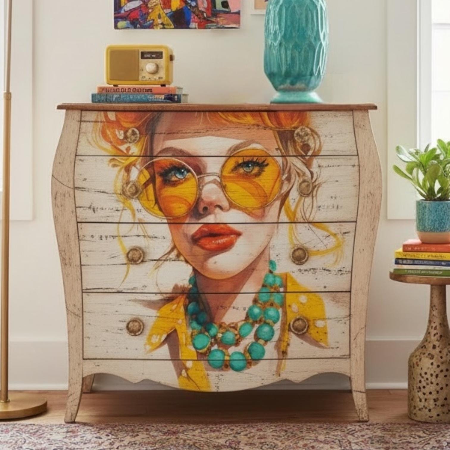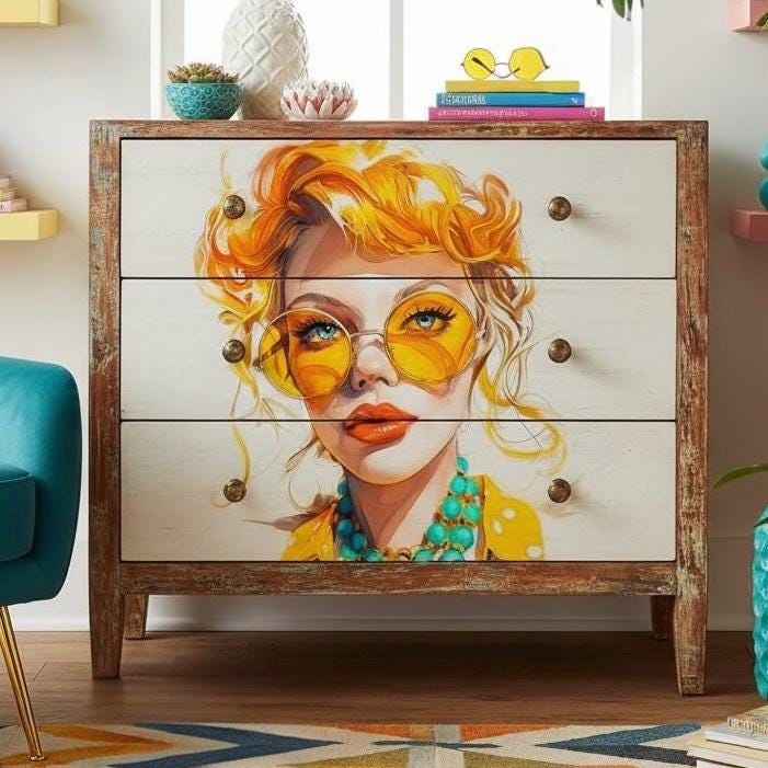 Add a splash of vibrancy to your crafts with this eclectic A4 rice paper. Featuring a stunning watercolor portrait of a woman with bright orange and blond wavy hair, big round yellow sunglasses, and a chunky turquoise necklace, this design screams boho-chic. The thin, fibrous texture is perfect for seamless decoupage on furniture, journals, and canvas art.