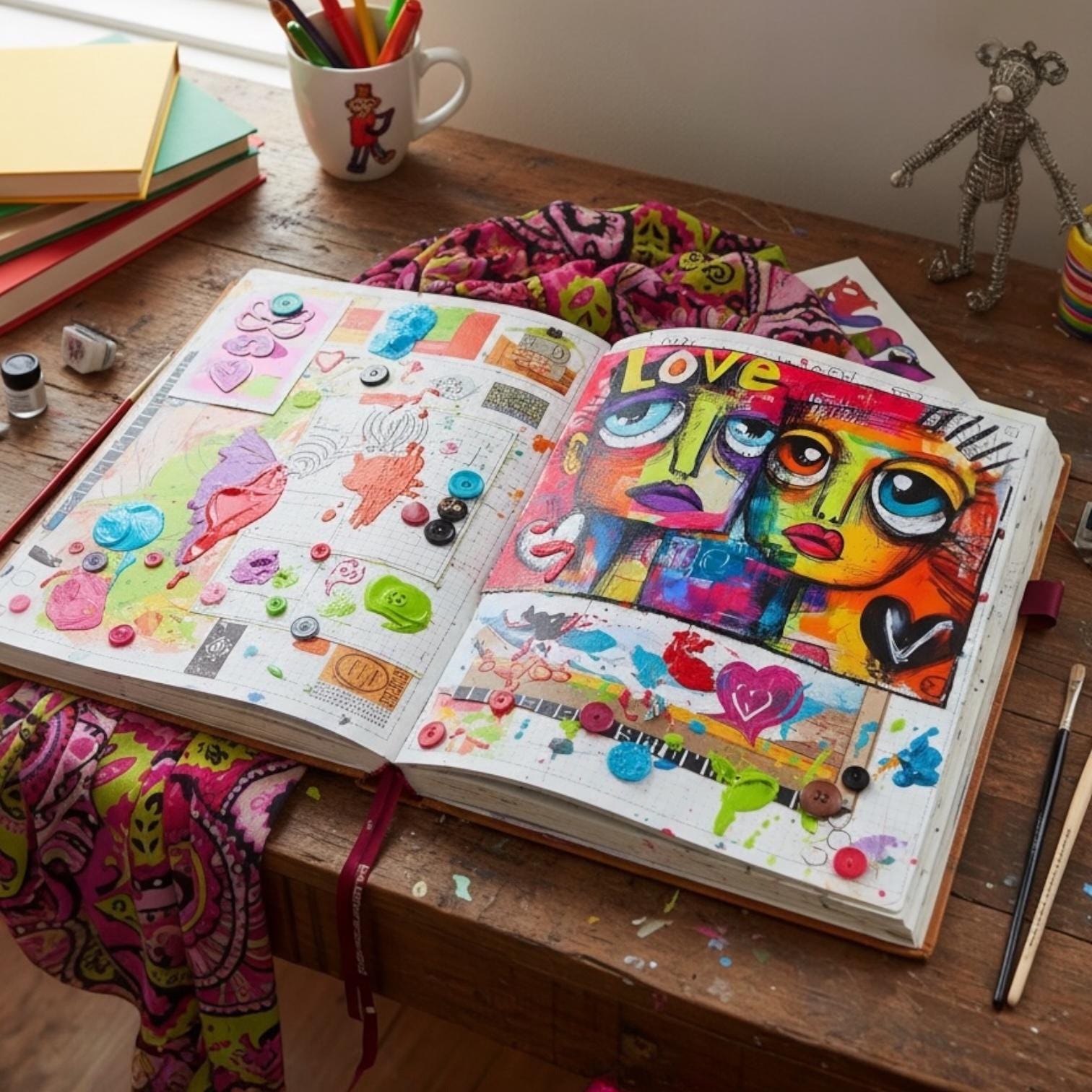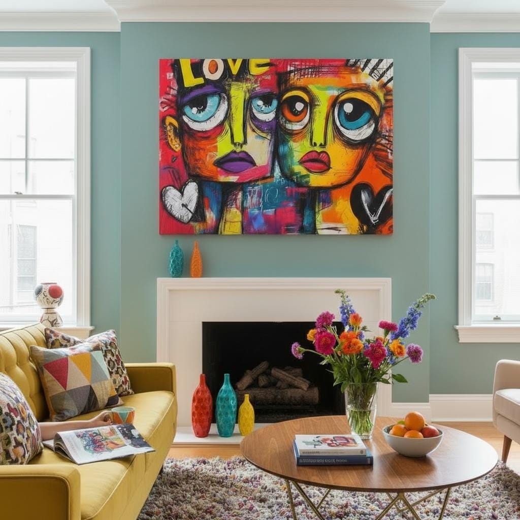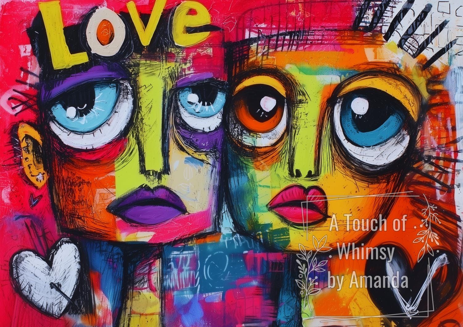 Inject vibrant urban energy into your work with this A4 rice paper. Featuring an abstract graffiti style with spray-painted heads, captivating big eyes, and bold pop art colors. Adorned with hearts and the word "LOVE," this sheet is ideal for edgy furniture upcycling, modern mixed media, and art journaling.