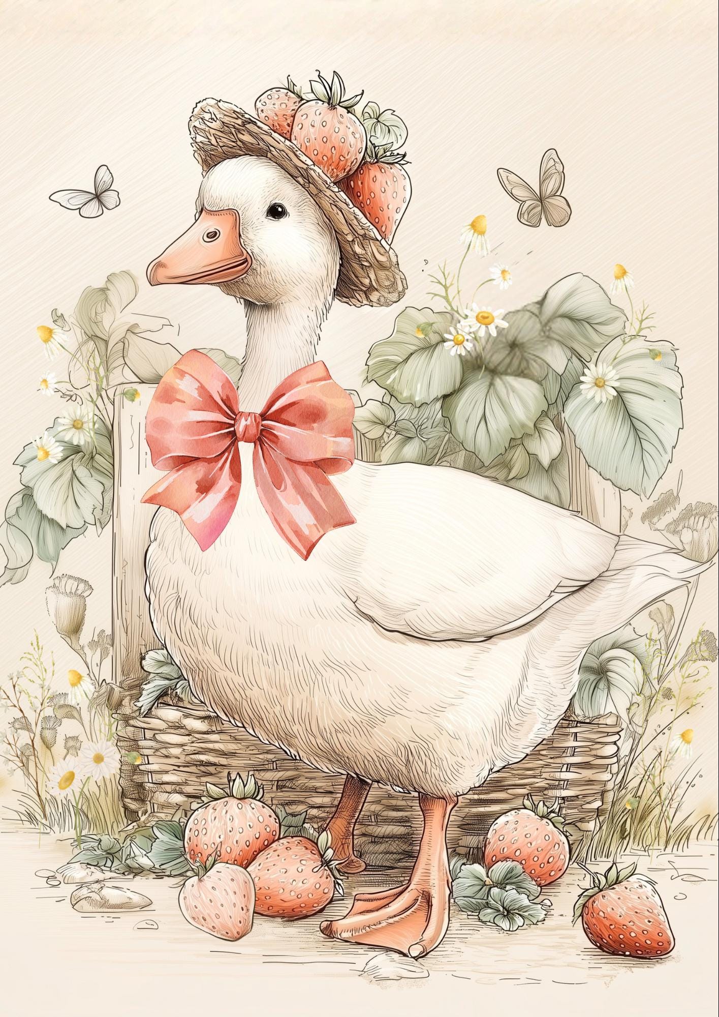 This delightful design features a charming white goose nestled among juicy red strawberries and soft green foliage. Painted in a soft watercolor style, it perfectly captures the cozy, nostalgic feel of a country garden