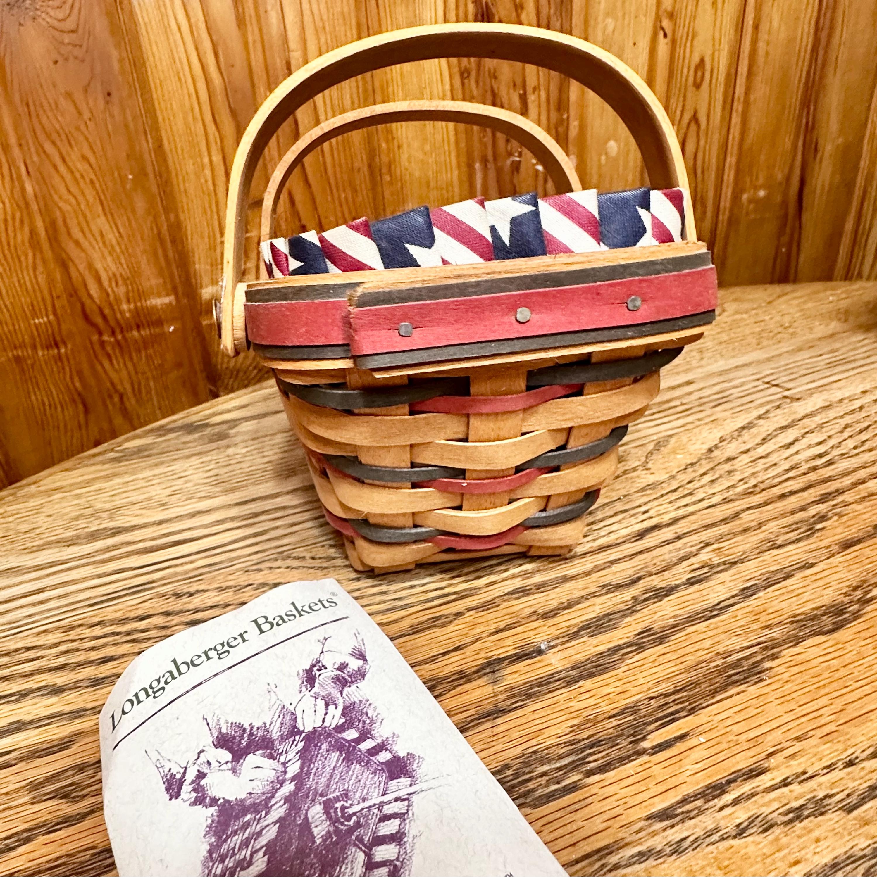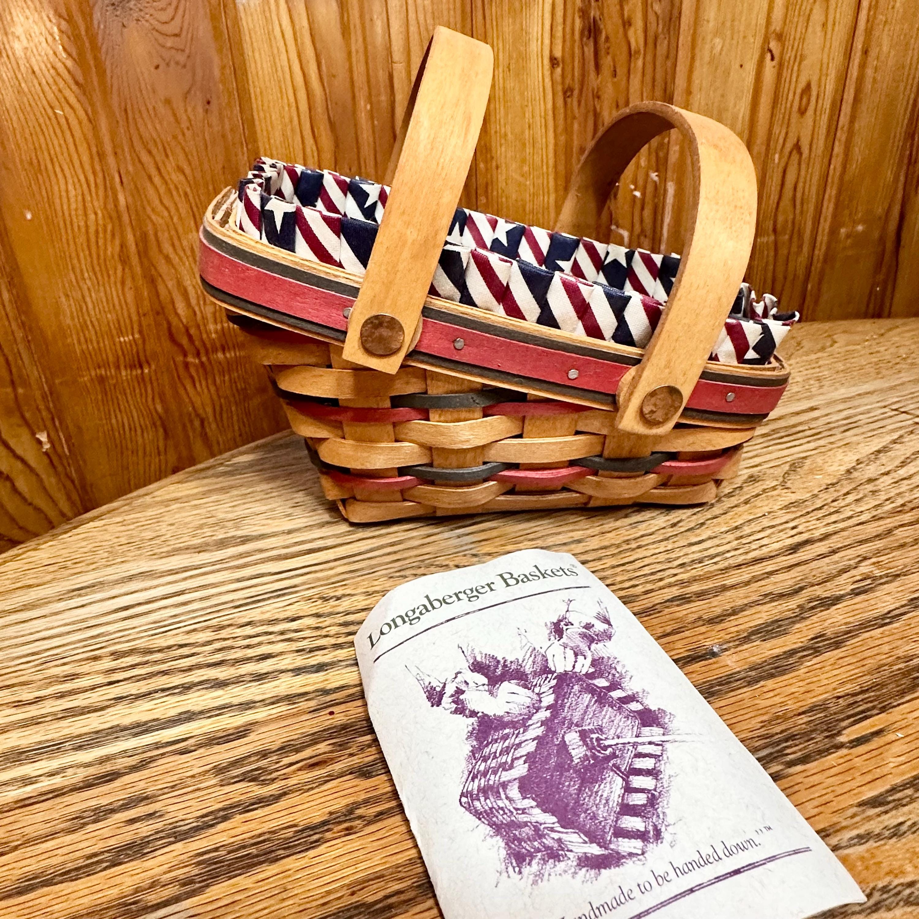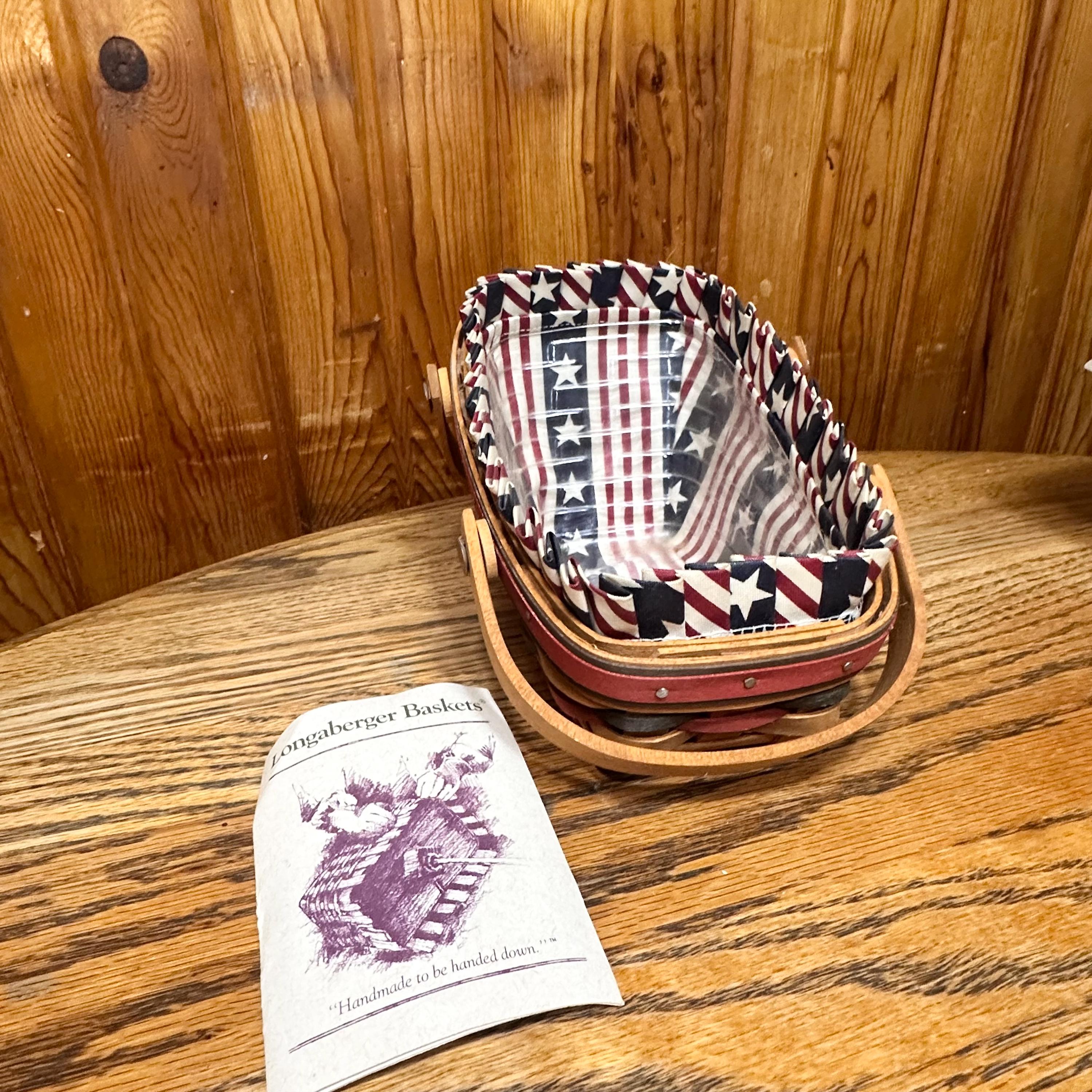 The product is a Longaberger 1996 All American Summertime Basket Combo Liner & Protector. This small rectangular basket features a woven pattern in brown color with a fabric fill material. Manufactured in 1996 by Longaberger, it is an original American-themed storage basket with a patriotic design. The basket comes with a handle and was handmade using weaving production technique, making it a collectible decorative piece for all occasions from the late 20th century.