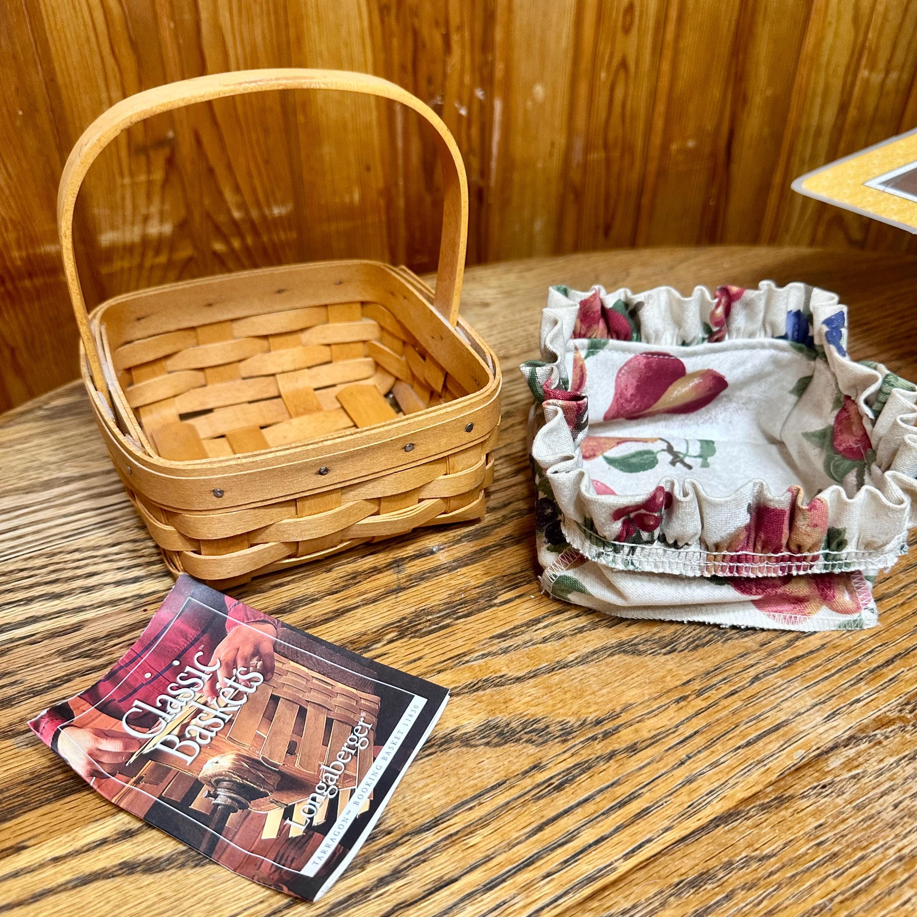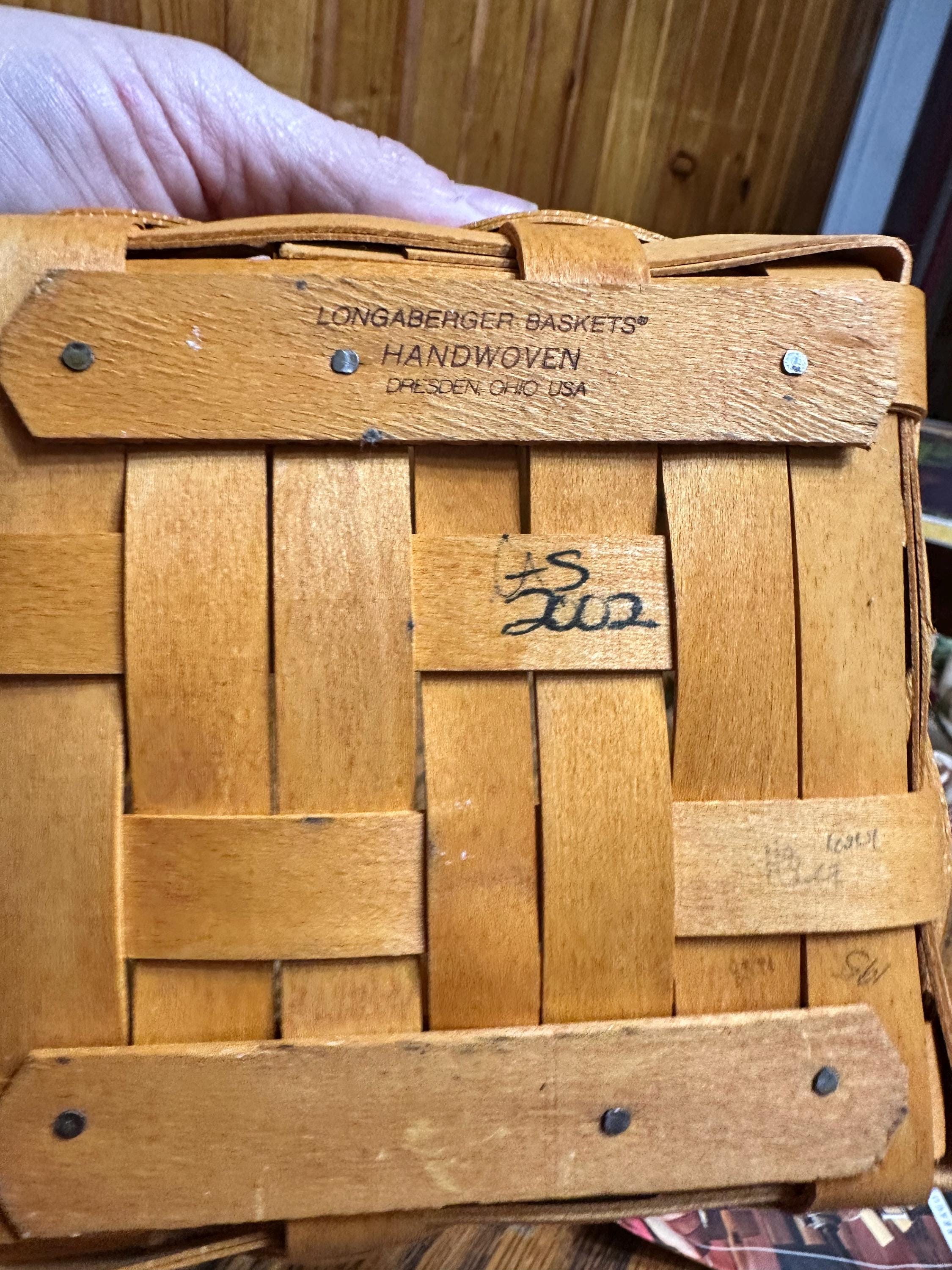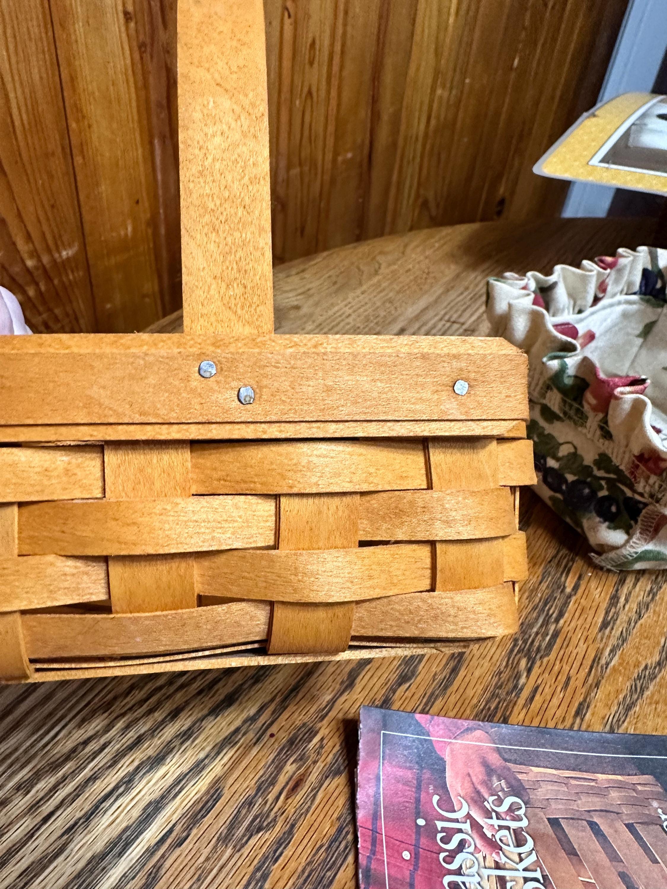 The Longaberger 2002 Small Berry Basket with Swing Handle is a handcrafted country farmhouse style decorative collectible. This square-shaped basket is made with wood, plastic, and fabric, featuring a stained finish and a woven brown pattern. With its unique swing handle and retired status, this basket is perfect for any room and all occasions. Made in the USA in the 21st century, this original piece from the Longaberger brand adds a touch of charm and nostalgia to any home decor.