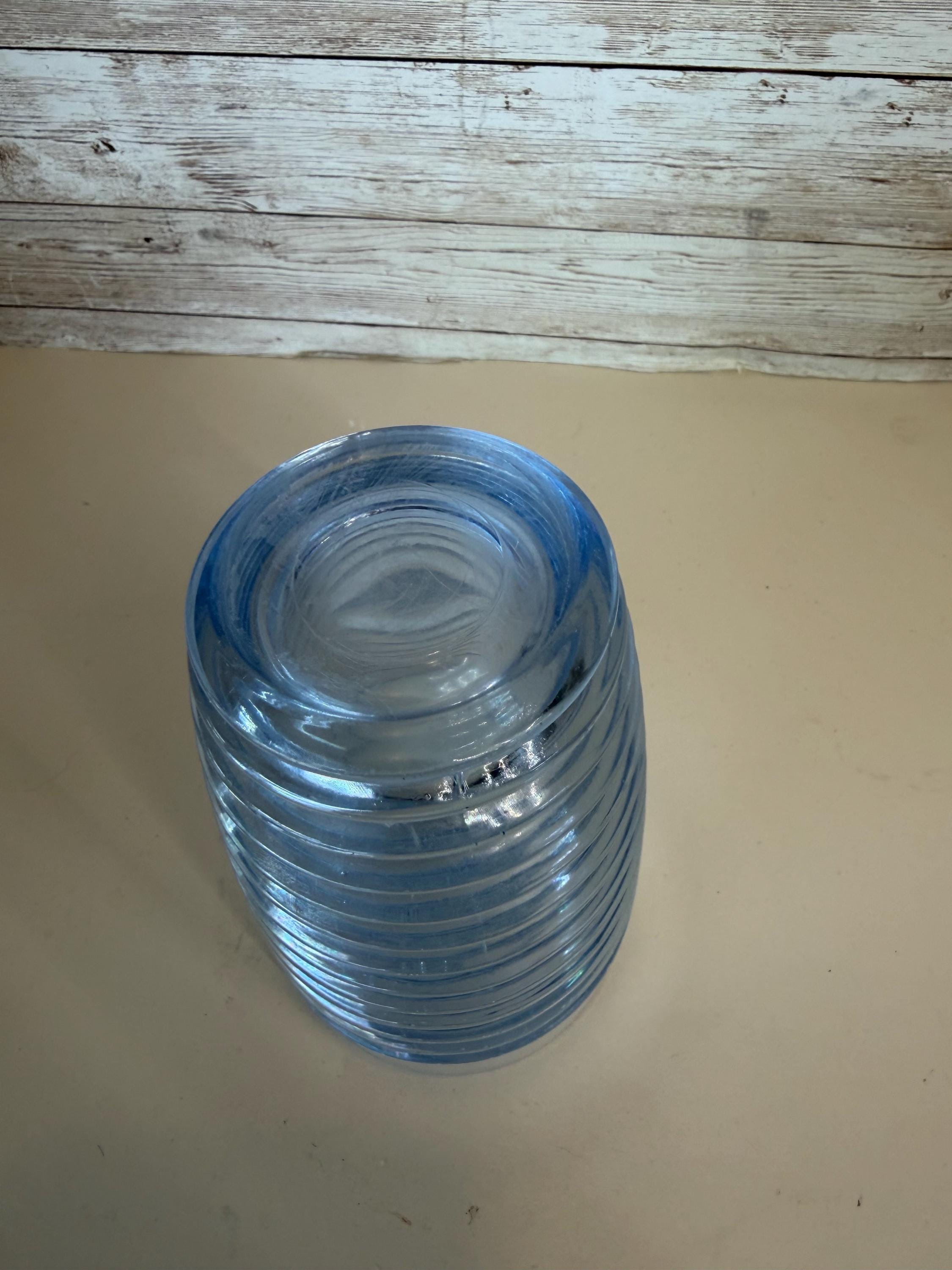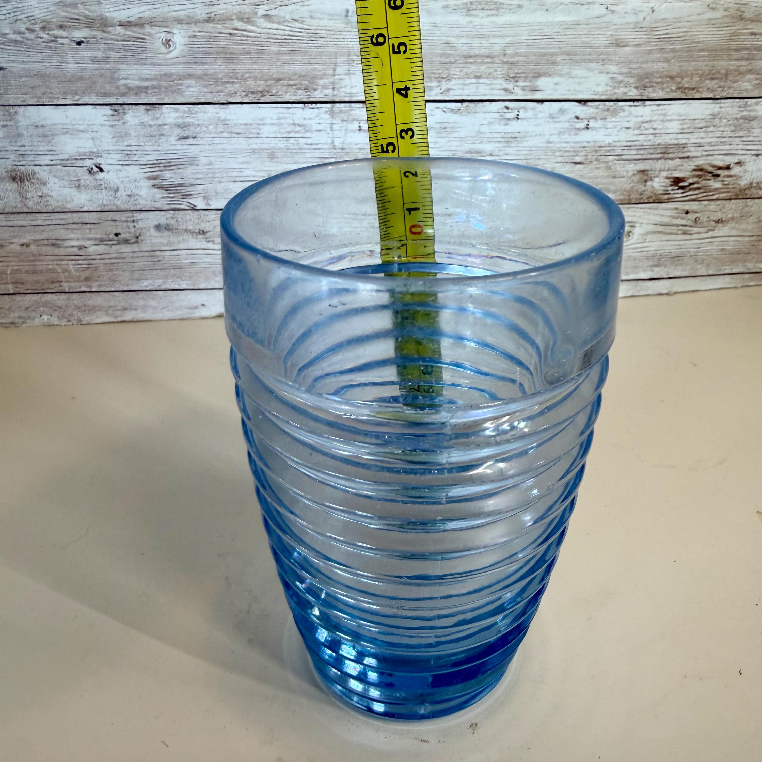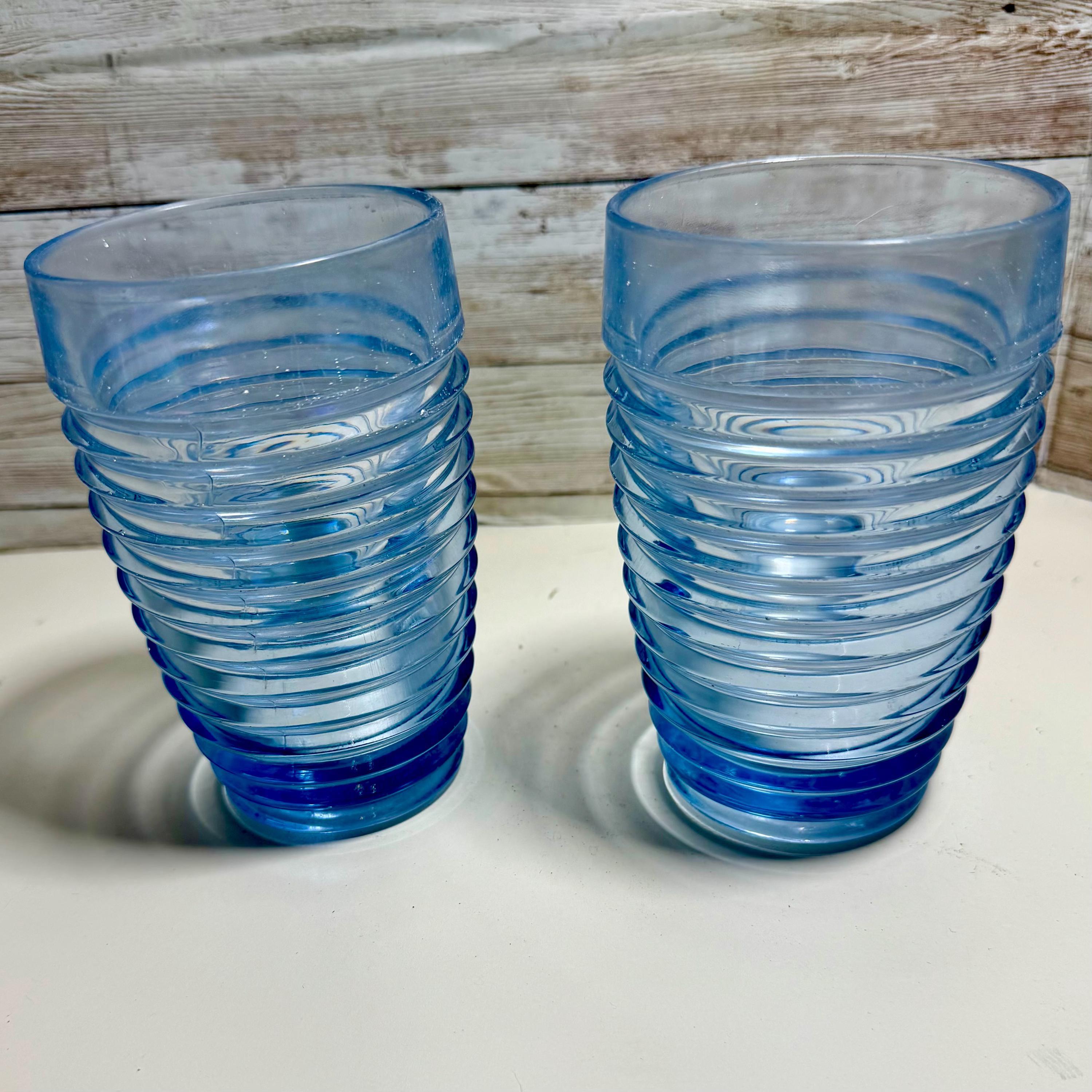 This set of 2 vintage Anchor Hocking Park Avenue Manhattan tumblers in ice blue rib ring is a nostalgic piece of American drinkware from the 1930s. Made of depression glass using a machine-made technique, these tumblers feature a round shape with a capacity of 10 oz. The Art Deco style and decorative Manhattan pattern make them perfect for all occasions, adding a touch of vintage charm to any table setting. Easy to care for with machine washable instructions, these tumblers are a timeless addition to any glassware collection.