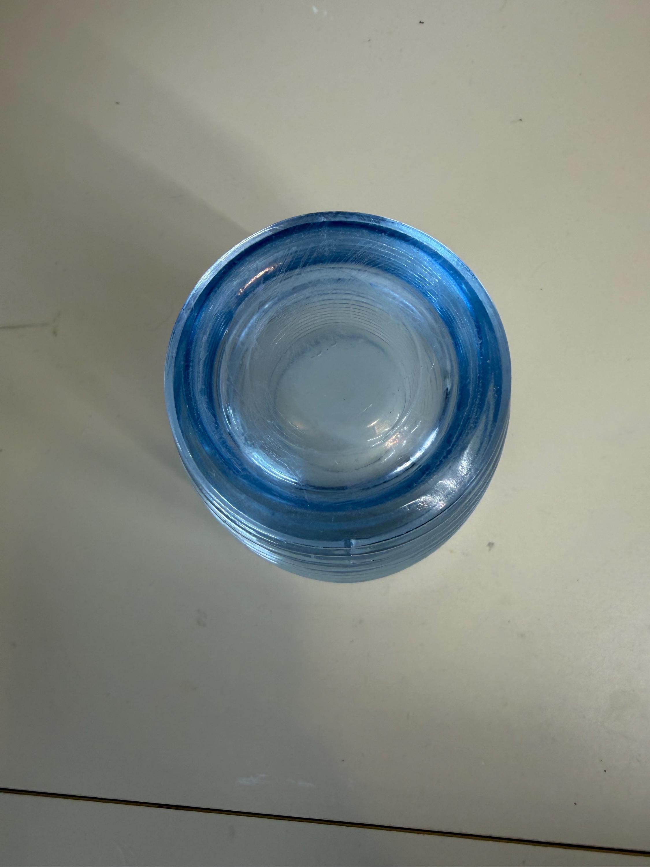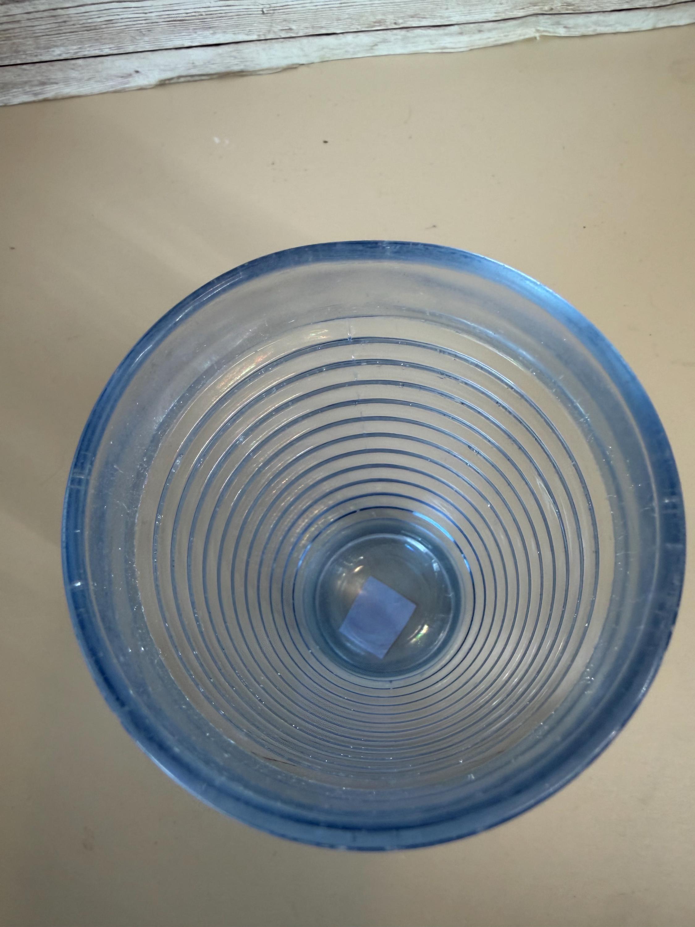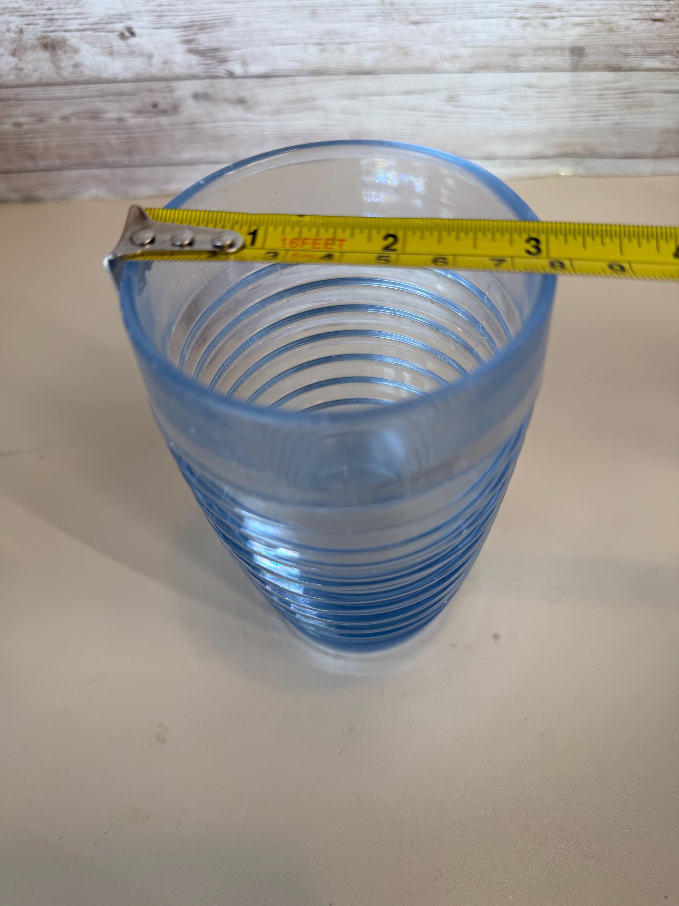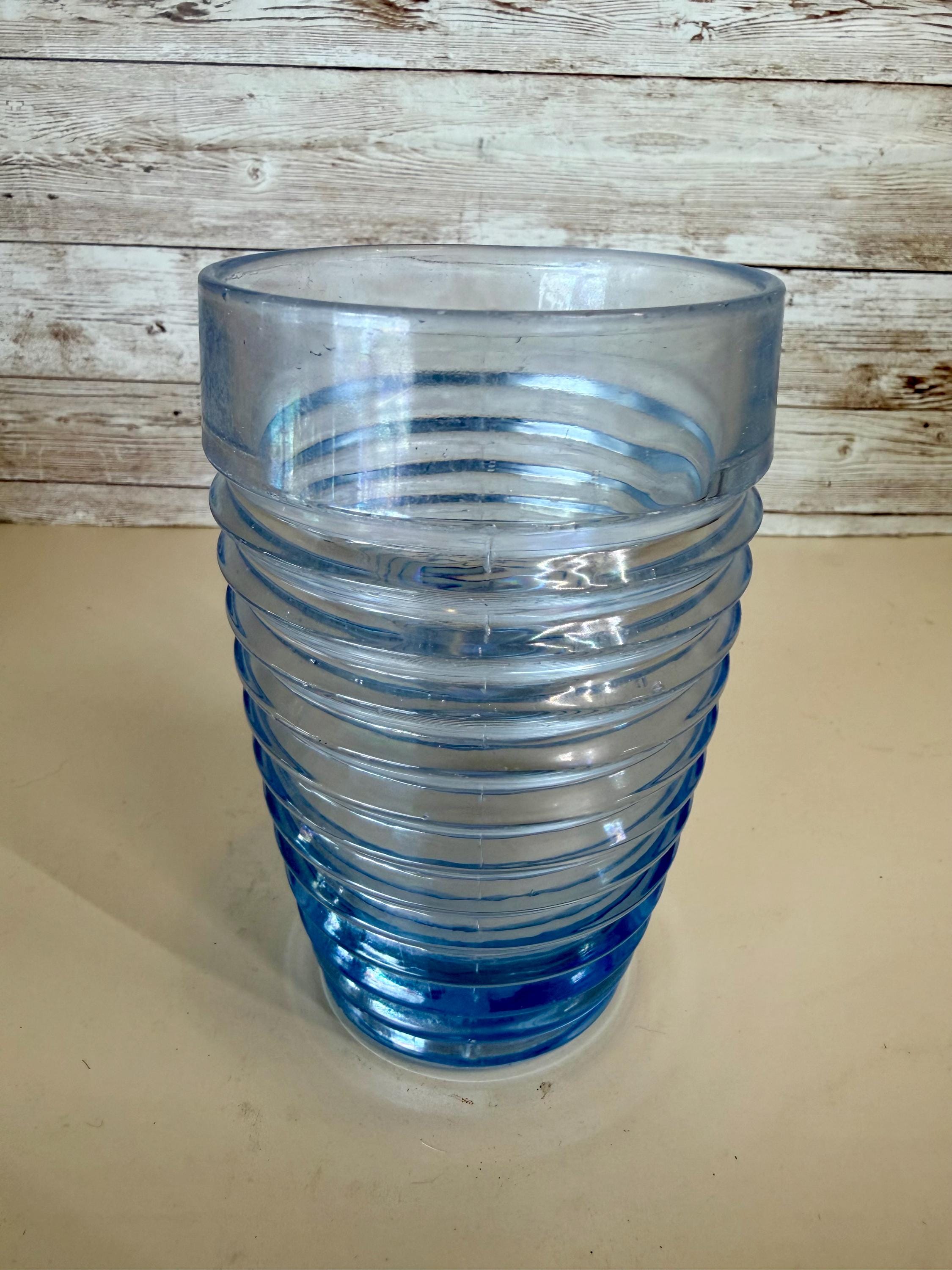 This set of 2 vintage Anchor Hocking Park Avenue Manhattan tumblers in ice blue rib ring is a nostalgic piece of American drinkware from the 1930s. Made of depression glass using a machine-made technique, these tumblers feature a round shape with a capacity of 10 oz. The Art Deco style and decorative Manhattan pattern make them perfect for all occasions, adding a touch of vintage charm to any table setting. Easy to care for with machine washable instructions, these tumblers are a timeless addition to any glassware collection.