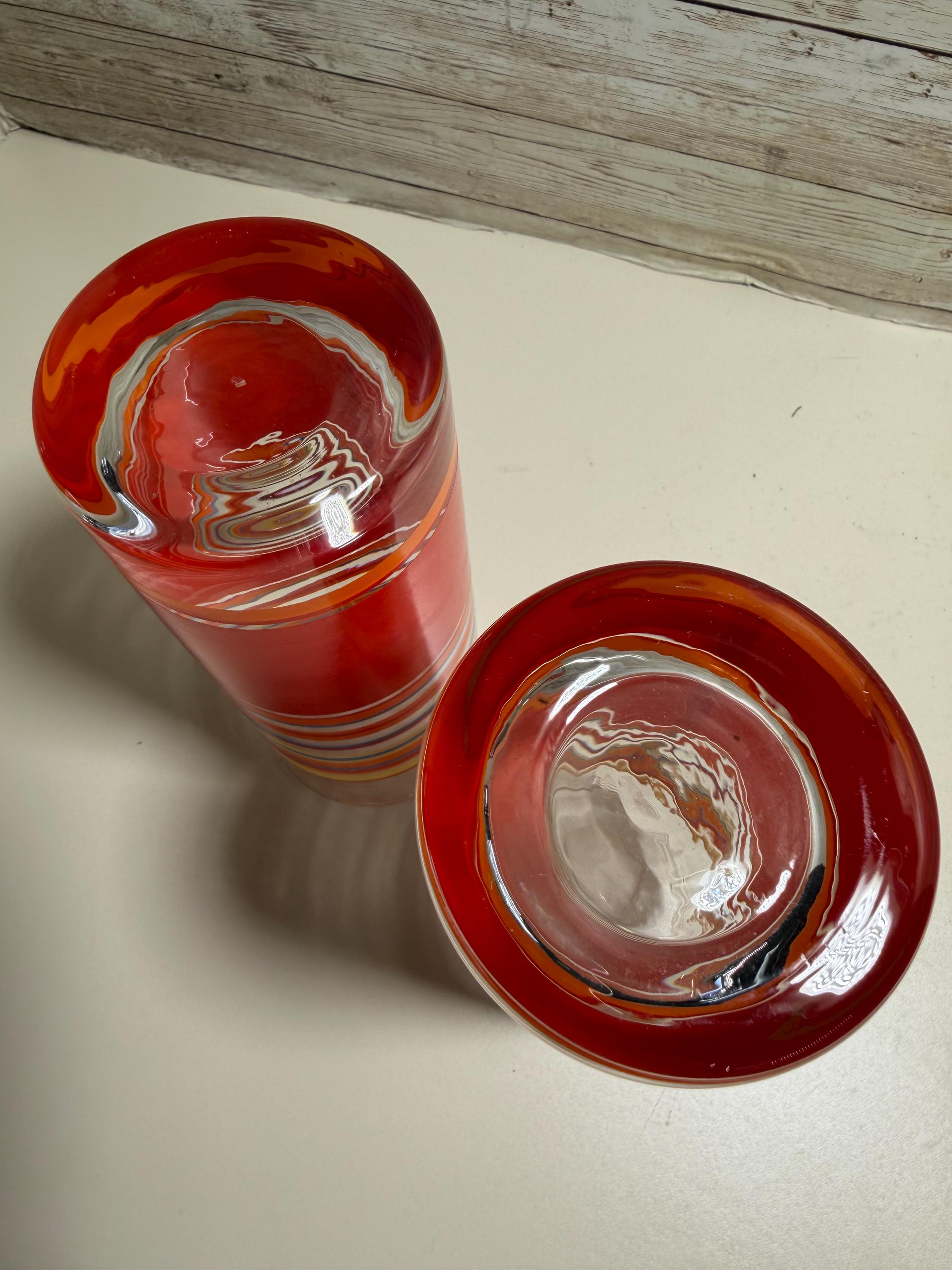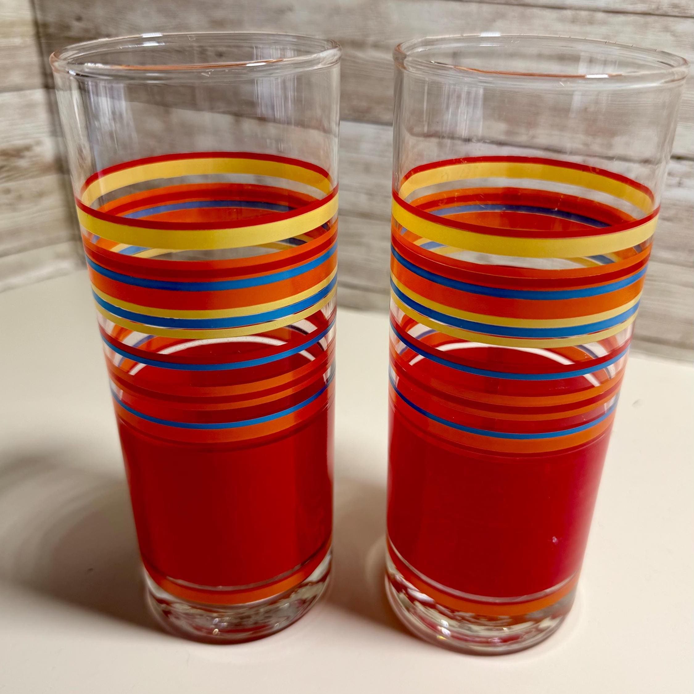 This set of two Fiesta Ware glasses tumblers is a retired highball set perfect for iced tea or other beverages. The round, multicolor tumblers feature a striped pattern, a glossy finish, and are made of pressed glass in the American art deco style. With a stackable design and original production technique, these tumblers are a stylish and unique addition to any drinkware collection. Made in the United States by Fiesta, these tumblers are unisex and suitable for all occasions. Hand wash only to keep them looking their best.