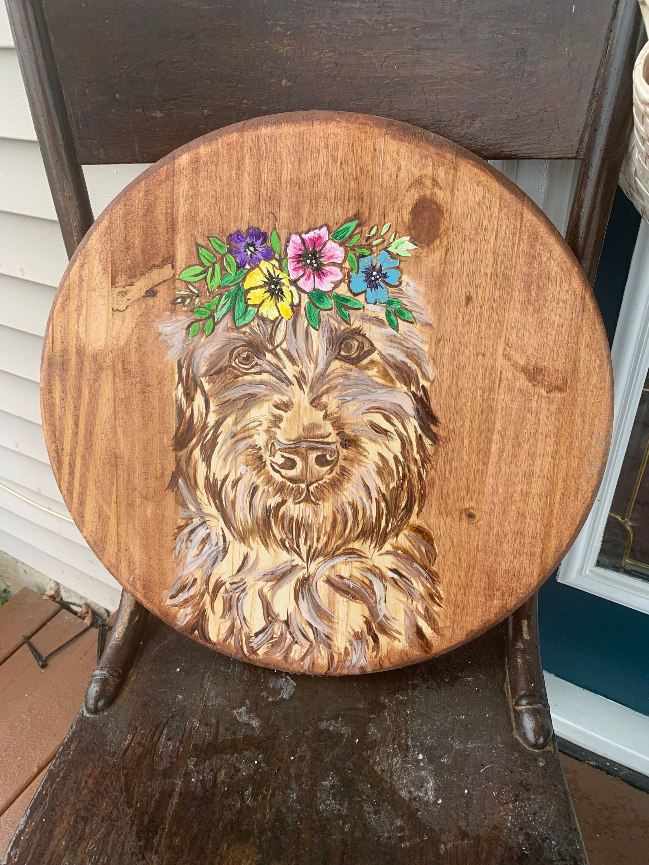 One of a kind stained goldendoodle on wood round. Stained on a 18” pine round. Stained with mahogany , simply white, golden pecan, honey maple, colonial maple and unicorn spit gel stain in dragons belly, pixie punk, white ning, midnights blackness, lemon kiss, molly red pepper, purple hill majesty, and aqua.
